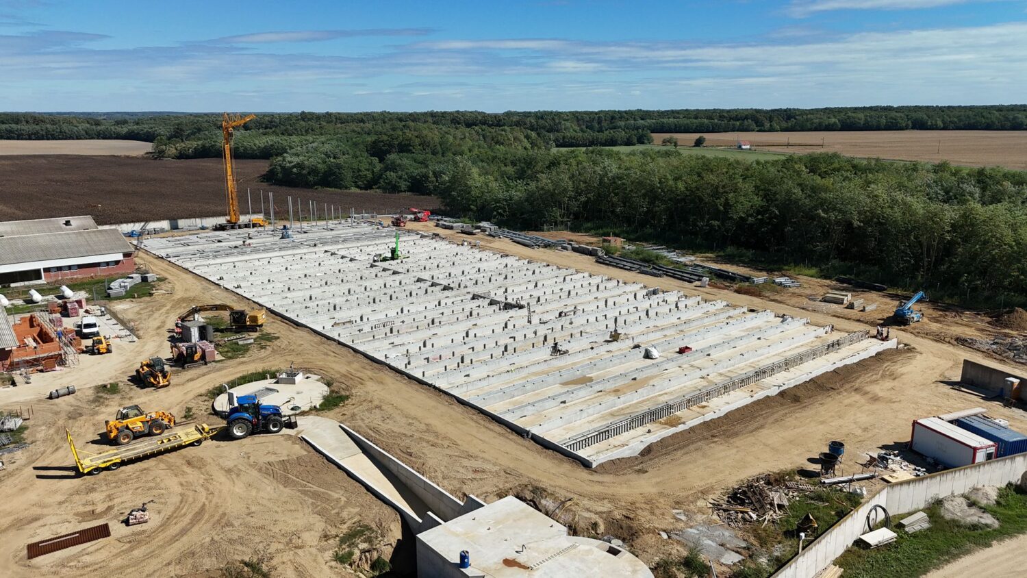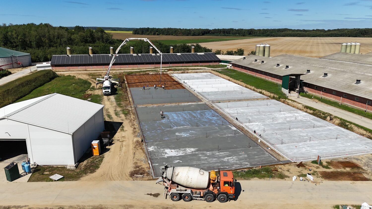 Az első munkálatok során a beton aknafalakra kerültek a rácspadlók, ehhez a Genugten saját daruját, teleszkópos rakodógépét és emelőberendezéseit használjuk a helyszínen. Saját eszközökkel biztosítjuk a munka folytonosságát és a projekt előrehaladását. Ezzel párhuzamosan megkezdődött az acélszerkezet építése, amely az istállók felépítményének adja meg a végső formát.